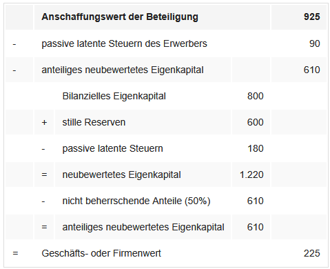 Wird ein Tochterunternehmen in der Rechtsform einer Kapitalgesellschaft erworben, so sind aufgrund der Aufdeckung der stillen Reserven und Lasten auch die latenten Steuern anzupassen, da die Neubewertung nur in der Handelsbilanz III und damit in der Konzernbilanz erfolgt, nicht jedoch in der Steuerbilanz des erworbenen Tochterunternehmens, so dass sich die handelsbilanziellen Buchwerte insoweit von den Steuerwerten unterscheiden. Während die Aufdeckung stiller Reserven zu passiven latenten Steuern bzw. latenten Steuerschulden führt, entstehen durch die Aufdeckung stiller Lasten aktive latente Steuern bzw. latente Steueransprüche.